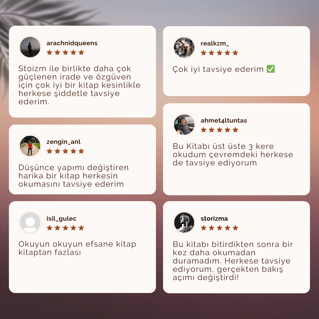 Stoizm ile birlikte daha çok güçlenen irade ve özgüven için çok iyi bir kitap kesinlikle herkese şiddetle tavsiye ederim.